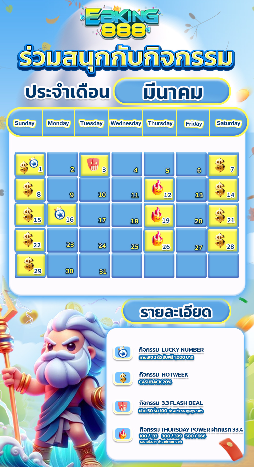 กิจกรรมภายในเดือน “มีนาคม” ผู้เล่นสามารถเข้ารับได้ตามรางปฏิทินที่เราขึ้นไว้ให้ได้เลย โดยเราจะมีการอัพเดทปฏิทินทุกวันที่ 1 ของทุกเดือน เพราะว่าหลังจากนี้ เว็บ EBKING888 จะมีการแจกโบนัสและของรางวัลอีกเพียบ !!